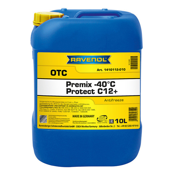 RAVENOL OTC Protect C12+ Premix -40°C – готовый к применению антифриз на основе 1.2-Ethandiol (моно этиленгликоля) и ингибиторов коррозии с использованием органической технологии OAT. Не содержит силикатов, боратов, нитритов, аминов и фосфатов. Обеспечивает долговременную (до 5 лет) антикоррозионную защиту алюминиевого двигателя как зимой, так и летом. Не опасен для окружающей среды.