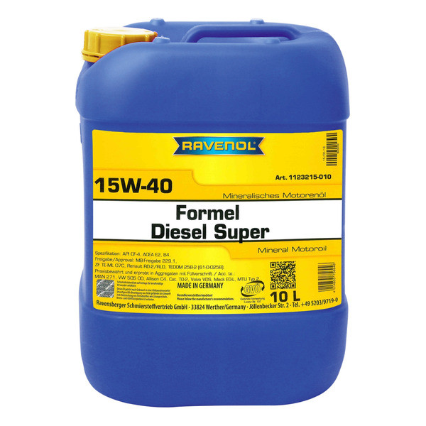 RAVENOL Formel Diesel Super 15W-40 - высококачественное минеральное моторное масло для дизельных двигателей легковых и грузовых автомобилей с турбонаддувом и без. Обеспечивает прочную масляную пленку и устойчивость к сдвигу, прекрасные очищающие свойства и высокую устойчивость к старению.