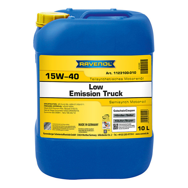 RAVENOL Low Emission Truck SAE 15W-40 – полусинтетическое моторное масло для грузовых автомобилей класса API CJ-4 с низкозольным пакетом присадок Low SAPS (низкое содержание сульфатной золы, фосфора, серы) для применения в автомобилях с 2007 года.
