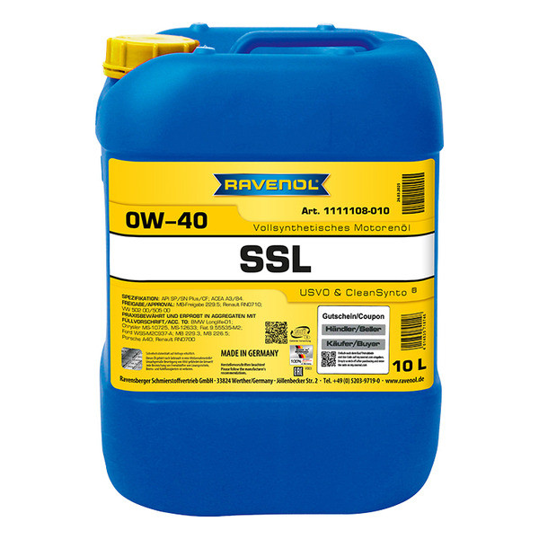 Полностью синтетическое ПАО масло RAVENOL SSL 0W-40 для легковых автомобилей Audi, BMW, Chrysler, Fiat, Mercedes-Benz, Porsche, Renault, Skoda, VW и других, требующих применения моторных масел с вязкостью SAE 0W-40 уровня качества ACEA A3/B4 с высоким щелочным числом, и эксплуатируются в условиях экстремально низких температур.