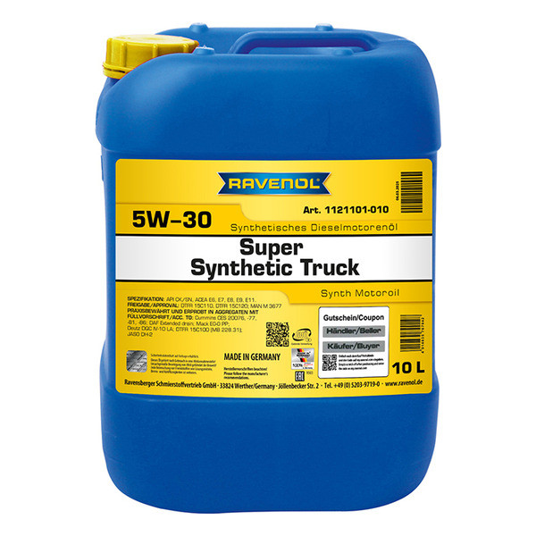 RAVENOL Super Synthetic Truck 5W-30 – синтетическое высоколегированное легкотекучее моторное масло с низкозольным пакетом присадок (Low SAPS) для круглогодичного использования в высоконагруженных турбодизелях класса EURO 4 и EURO 5 грузовых автомобилей, автобусов, строительной техники с и без фильтров отработанных газов и катализаторами. Если иное не указано автопроизводителем, интервал замены на данном масле может быть увеличен до 100 000 км.