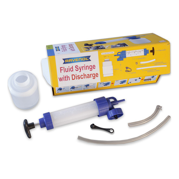 RAVENOL Fluid Syringe with Discharge - ручной шприцевой насос для замены масла, с корпусом из прозрачного пластика и с емкостью прим. 1 л. Масло можно нагнетать шприцем из прилагаемой емкости, а также использовать ее для слива жидкости.