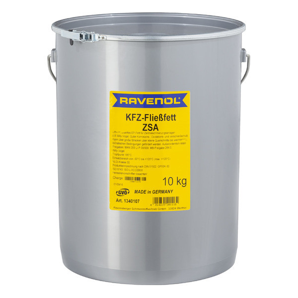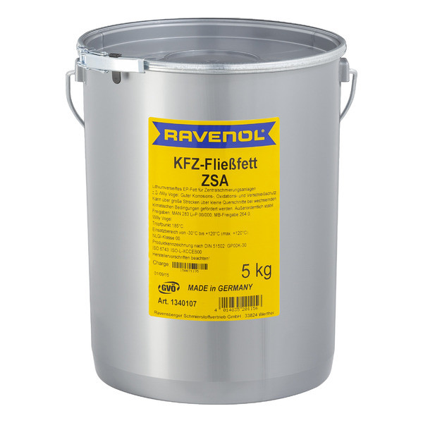 RAVENOL KFZ-Fliessfett ZSA – универсальная смазка, изготовленная в Германии на основе синтетического базового масла с использованием в качестве загустителя литиевое мыло и противозадирных присадок для применения в централизованной системе смазки.