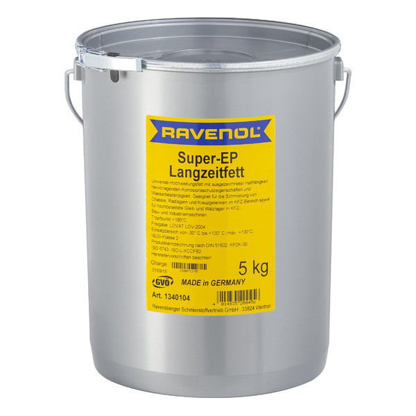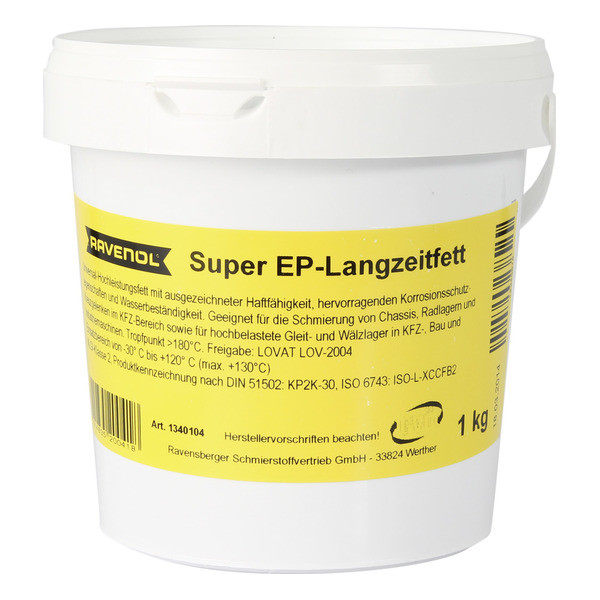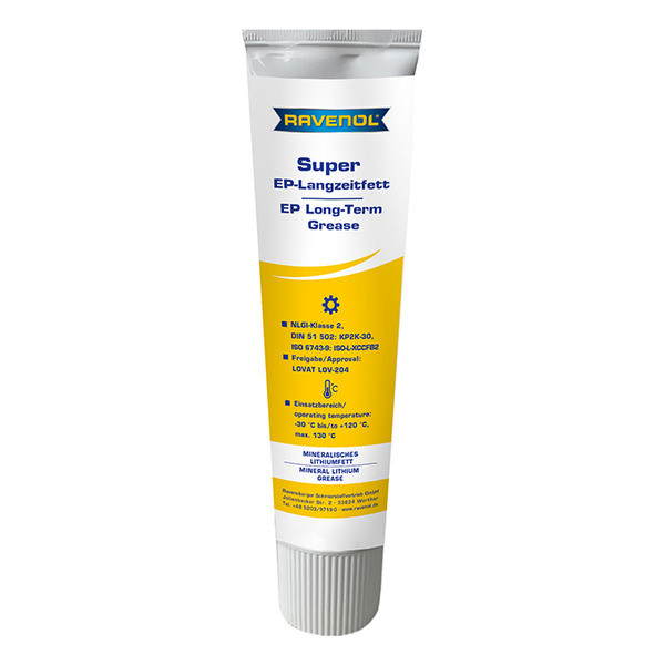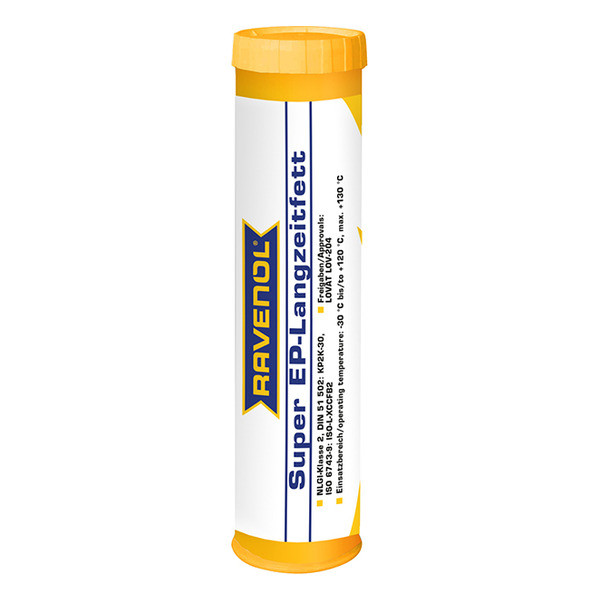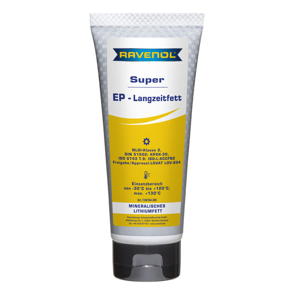 RAVENOL Super EP-Langzeitfett - автомобильная смазка на минеральной основе, загущенная литиевым мылом с добавлением антиоксидантных и антикоррозионных, противозадирных присадок (ЕР), что способствует продлению срока службы смазываемых частей и уменьшению износа.