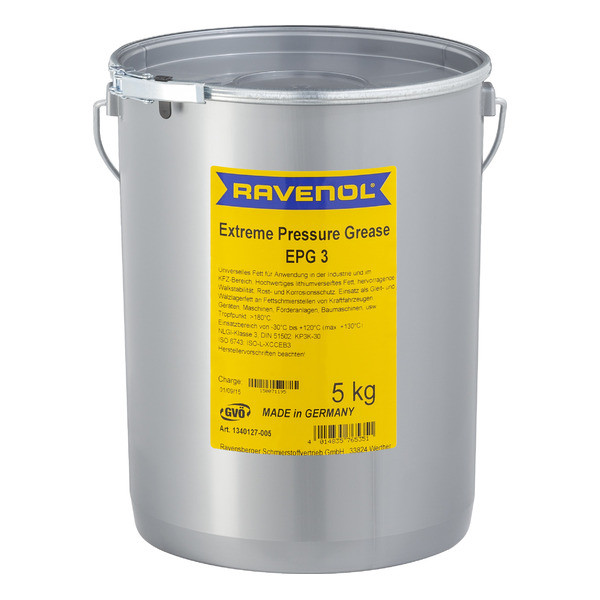 RAVENOL Extreme Pressure Grease EPG3 - автомобильная смазка на минеральной основе, загущенная литиевым мылом для подшипников скольжения, качения автомобилей, механизмов, устройств, конвейерных установок, строительной техники и т.д. Стабильность к вытеканию, защита от коррозии и ржавчины.